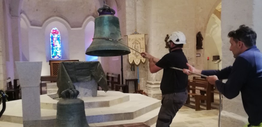 Installées en 1850 et 1872, les deux cloches de l'église de Saint-Sauveur ont été envoyées en restauration. Nous avons assisté à leur dépose et Pauline Jauffrit, guide-conférencière au service patrimoine de la mairie de l'Ile d'Yeu, en a profité pour raconter leur histoire, ainsi que quelques évènements qui ont marqué la vie de l'église. Mais saviez-vous que ces cloches ont des noms ?