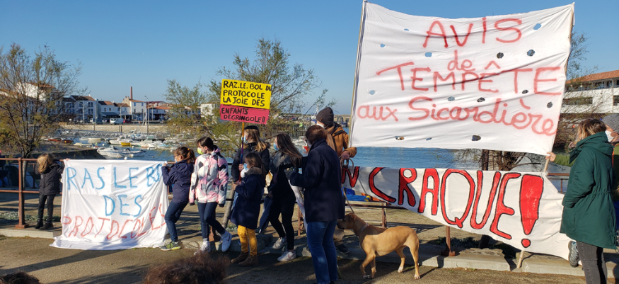 Ils étaient près de 80 à l'Ile d'Yeu ce jeudi 13 janvier à rejoindre le mouvement de grève national contre le protocole sanitaire dans les écoles. Enseignants, animateurs, enfants et parents d'élèves, comme Roxane, venue soutenir les professeurs en participant à cette marche : "On est épuisés nous aussi en tant que parents, de devoir nous adapter en permanence, de voir que nos enfants ont des conditions d'apprentissage qui deviennent déplorables. Donc oui, on est là pour les soutenir !". L'ensemble des syndicats des métiers de l'enseignement s'entendent pour réclamer une meilleure gestion de la crise sanitaire. Une chance pour Audrey, assistante de direction et animatrice d'une structure jeunesse, qui s'est jointe à la manifestation : "On est toujours la dernière roue de la charette [...] nous aussi on est fatigués, on est épuisés et les protocoles à la dernière minute c'est juste plus possible !".