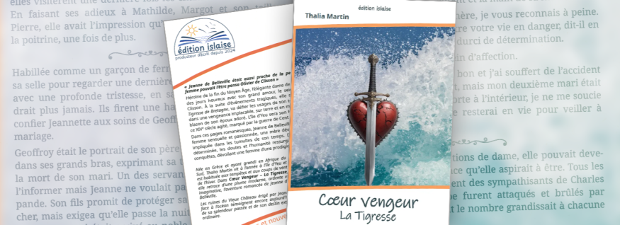 Installée à l’année sur l’Île d’Yeu, Thalia Martin, née en Grèce et ayant grandi en Afrique du Sud, publie son premier roman Cœur Vengeur – La Tigresse, fruit d’un an de travail. Dans ce récit porté par une écriture moderne et intense, elle revisite l’histoire de Jeanne de Belleville, figure historique qui l’a profondément inspirée. Si l’ouvrage relève du roman, un important travail en amont lui permet de rester au plus près de la réalité et des faits historiques. Aux côtés de son éditeur Benoît Gaborit (Édition Islaise), elle revient avec nous sur la genèse de ce livre, son écriture et les sources qui ont nourri cette aventure.