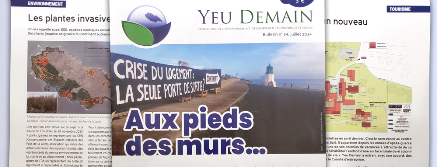 Depuis sa création en 1972, l'association Yeu Demain œuvre pour l'environnement et le développement économique et social sur l'île. Hommage, immobilier, écologie, tourisme... Alain Fadié, co-président de l'association, et François Niney, membre du conseil d'administration, nous présentent les sujets de leur bulletin d'information n°54, sorti en juillet 2024.