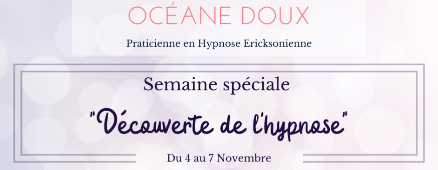 Du 4 au 7 novembre 2019, Océane Doux, praticienne en hypnose ericksonienne vous propose de découvrir cette approche thérapeutique souple et indirecte destinée à tous au niveau physique, comportemental et développement personnel, bien loin du sensationnalisme d'un certain Messmer...
